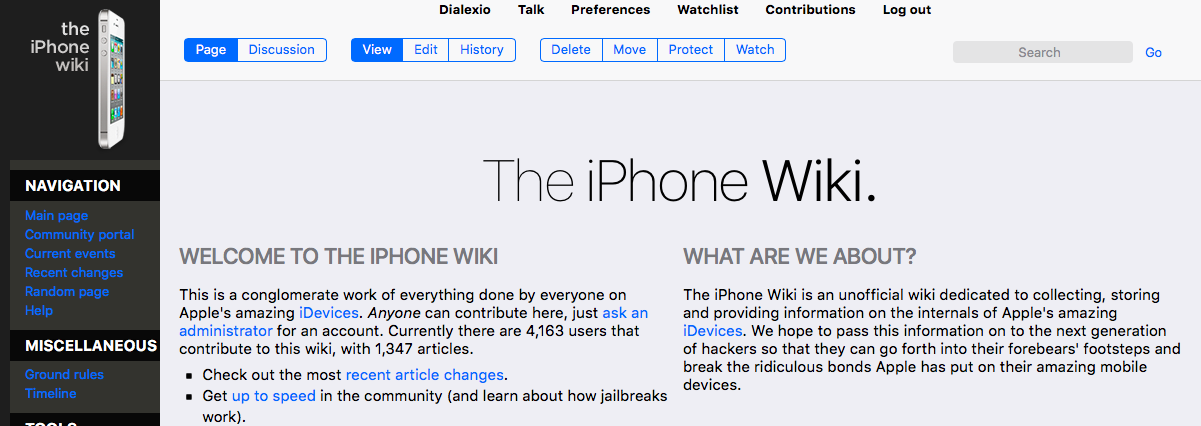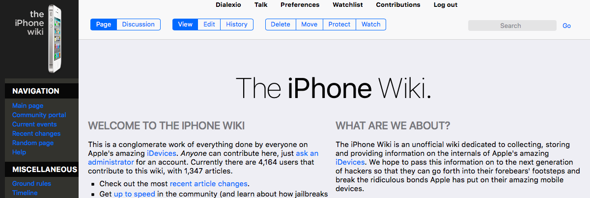 - There's already Useful Links with some links to other core community resources (which could be updated and rearranged) - I was just thinking that it'd be especially useful to link to iPhoneDevWiki prominently since it's likely for TheiPhoneWiki visitors to also be interested in relatively-organized technical information about development. Changing the name of "Up to Speed" sounds fine to me too - that page didn't get much attention since 2008 until I sort of commandeered it to serve as an "intro to jailbreaking" page. :) It could be renamed "getting started", as in "how to get started on learning about research into iOS devices, especially security research (such as jailbreaks)". Britta (talk) 00:31, 21 October 2013 (UTC)